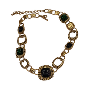Oscar De La Renta gorgeous substantial necklace/belt. Vintage classic. Expertly crafted by Oscar De La Renta, this stunning necklace boasts unmatched designer quality. The brassy gold hardware is complemented by rich blue, purple and green glass details, resulting in a versatile piece that can also be worn as a belt. At 28" in length, it adds a touch of sophistication to any outfit.